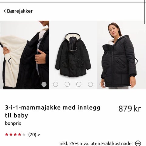 Det følger med graviditetstykke og bærestykke. Jakka har glidlås både foran og bak, så barnet kan bæres enten på magen eller på ryggen.