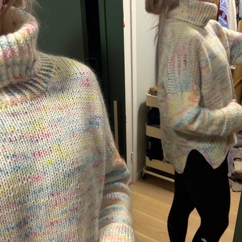 Louisiana sweater fra danske strikkedesigner Petiteknit. Genseren er strikket i børstet alpakka, myk og god alpakkaull fra Sandnes garn. Fargen heter «brunt sukker». Str. S, men litt oversized så passer en M også.