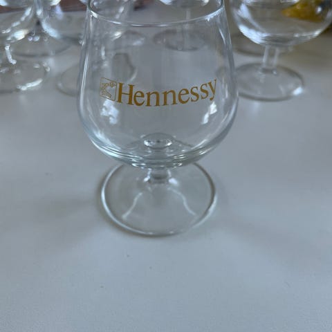 Selger totalt 12 originale Hennessy konjakkglass med den ikoniske logoen og de tre stjernene etset i glasset. Dette er de klassiske "snifter"-glassene som er designet for å fremheve aromaen i konjakken.