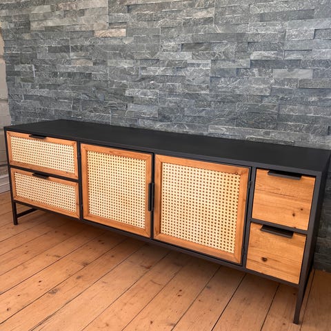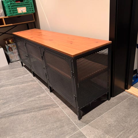 skjenk med metallunderstell og treplate. Skjenken har svart ramme og fronter i perforert metall, kombinert med en topplate i tre med varm brun tone. Møbelet består av tre seksjoner med dører foran, som gir oppbevaringsplass til for eksempel servise, bøker eller elektronikkutstyr. Passer som lav skjenk i stue, gang eller TV-rom. Designet er funksjonelt og industrielt preget, og gir god oversikt over innholdet bak dørene.