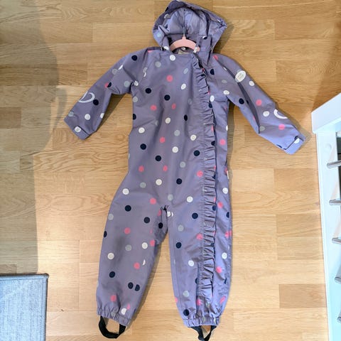 Regndress fra Reflex, str. 86. Praktisk hette, refleksdetaljer og strikk under beina. Brukt, men mye bruk igjen.