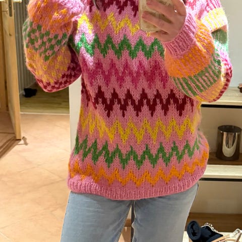 Ull er gull🥰🙏🏻 Kun brukt 1 gang. Jeg samler på ullgensere, så har jeg litt dilla på rosa om dagen😂❤️🩷Så da blir denne bare liggende. Kjøpte den for 2200 kroner av noen som hadde strikket den og ikke brukt den selv🥰🤗