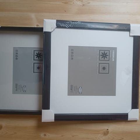 IKEA (?)bilderammer i ulike størrelser. Én ramme i trelook med format 28 x 35 cm, egnet for bilder og plakater i tilsvarende størrelse. Én svart clip-ramme med format 30 x 40 cm. I tillegg en mørk ramme med passepartout egnet for bilder i størrelsene 30 x 40 cm og 21 x 30 cm, ifølge informasjon på innsiden. Rammene kan brukes til innramming av bilder, foto eller plakater til veggdekorasjon i hjem eller kontor.