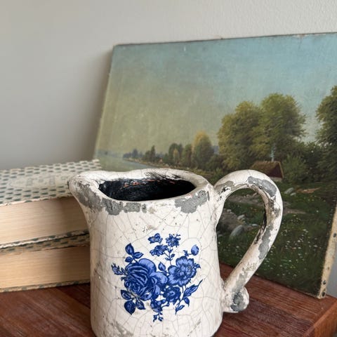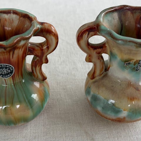 Vintage keramikkvase og mugge i flerfarget glasur. Settet består av én bølget vase og én liten mugge med hank. Begge deler har håndlaget preg med kombinasjon av grønne, brune og lyse toner i glasuren. Egnet som dekorasjon, til blomster eller som små bruksgjenstander i interiøret. Merking under bunn, men produsent er ikke identifisert.