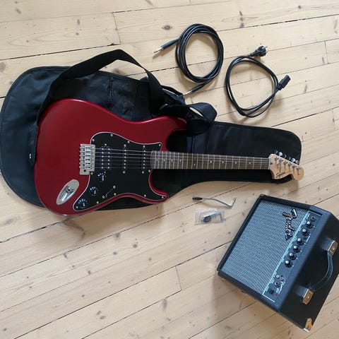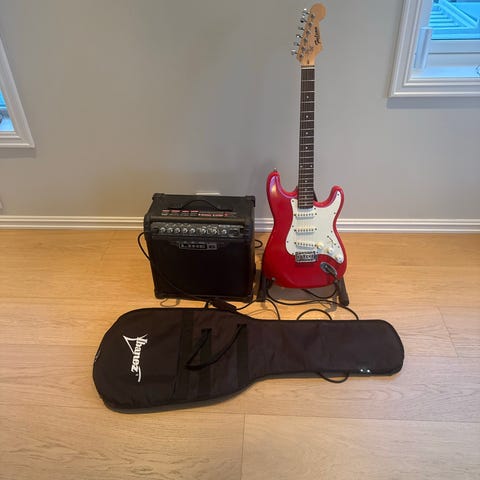 Det følger med en Ibanez elektrisk gitarforsterker med flere kontroller for lydjustering, inngang for gitar og hodetelefonutgang. Sett egner seg til øving hjemme eller i øvingslokale for ulike musikkstiler som rock, pop og blues.