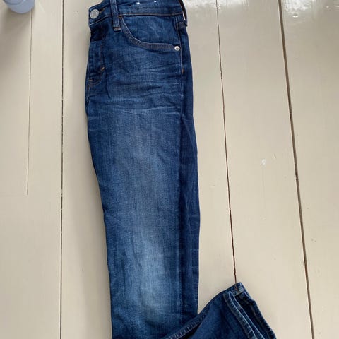 Gina Tricot jeans for jente i størrelse 152. Buksen har en lys blå vask. Modellen er flared. Lite og pent brukt. Kan reguleres i livet.