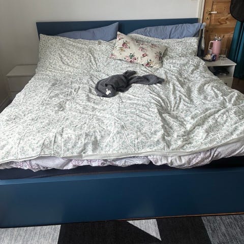 Selger en svært pent brukt sengeramme med gavl, og tilhørende madrass (og overmadrass).