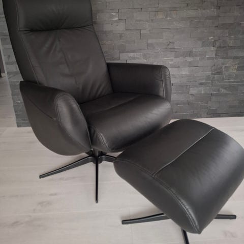 Lenestol i skinn med sving og regulerbar rygg. Må hentes.