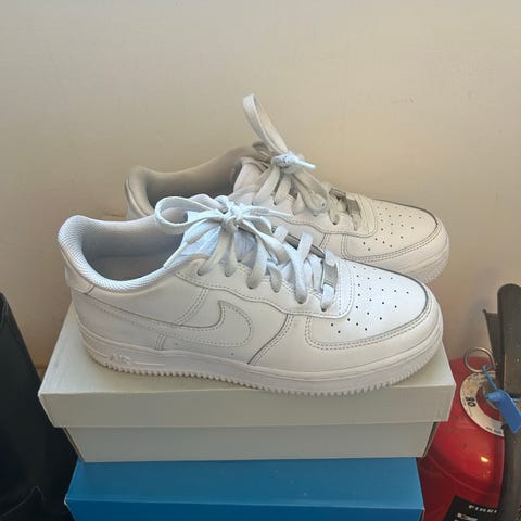 Nike Air Force 1 sneakers i størrelse 40. Modellen er en klassisk basketball-inspirert joggesko med høyt skaft og ankelrem. Skoene er i blå farge med perforert tåparti for ventilasjon og klassisk Nike-logo på sidene. Overdelen ser ut til å være i syntetisk/tekstilmateriale med snøring foran og gummisåle med sirkelmønster under for grep. Passer som fritidssko og hverdagsbruk.