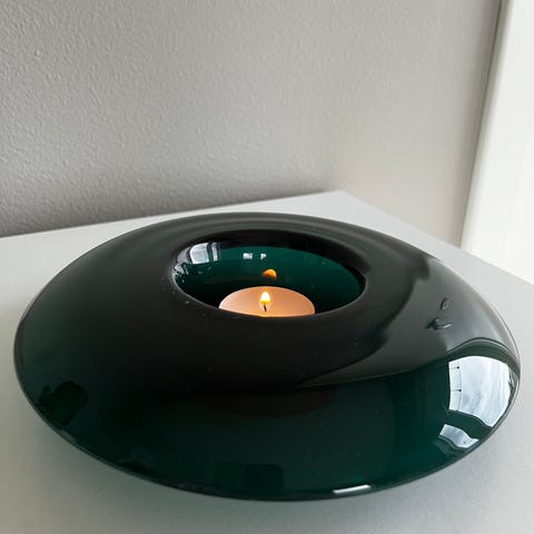 Blå firkantede glasslysestaker med preget solsikkemønster på sidene. Lysestakene er laget i gjennomfarget blått glass og har åpning på toppen til plassering av lys. Egner seg til bruk med mindre kubbelys eller telys, og kan brukes både som borddekorasjon og stemningslys i ulike rom.