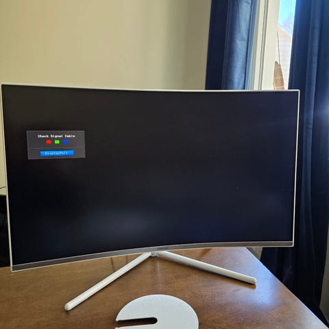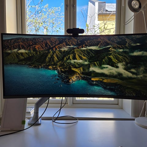 Samsung C34F791WQU buet skjerm med 34 tommers skjermstørrelse. Skjermen har hvit bakside og rund fot. På baksiden finnes blant annet HDMI-inngang og DisplayPort. Strømforsyning og tilhørende kabler følger med, slik det vises på bildene. Rammen under skjermen har noen synlige merker - se bildet.