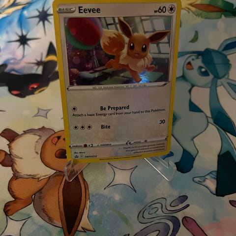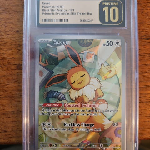 Selger et gradert Eevee SWSH173 promo kort fra Prismatic Evolutions Elite Trainer Box.