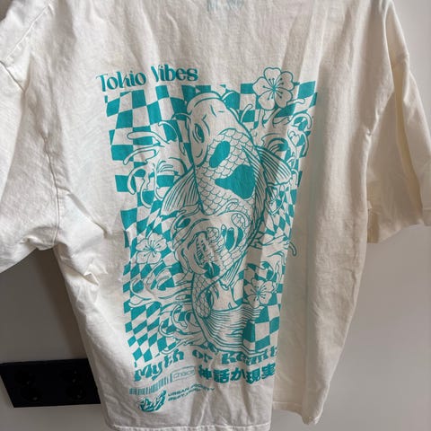 H&M skjorte for herre i størrelse XS. Skjorten er hvit og laget av bomull. Den har korte ermer, krage og knepping foran. På brystet og på ryggen er det trykk med grønn tekst og motiv. Passer til hverdagsbruk eller fritid, og kan brukes alene eller over en T-skjorte.
