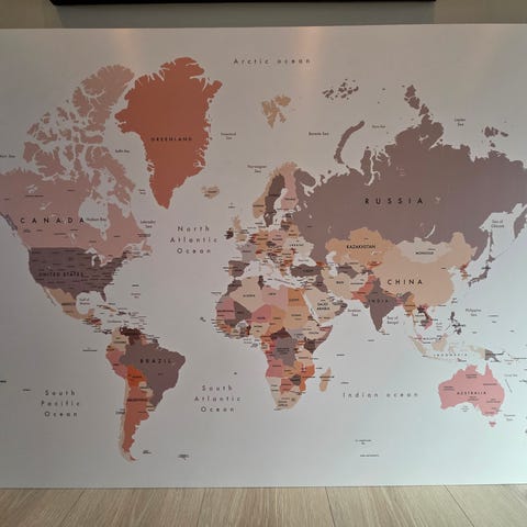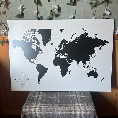 Korktavle med verdenskart for å sette pins på steder man har besøkt.