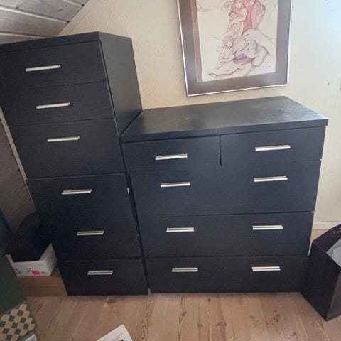 Gis bort. Svart. Fra Skeidar eller Bohus tror jeg. Har bruksmerker. Skuffer fungerer. Må bæres ut selv. Er noen trapper ned fra inngangen.