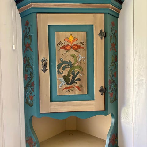 Hjørneskap tre grønn og rød med rosemalt dekor