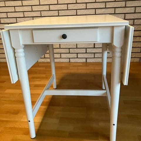 IKEA bord med klaff og skuffer i hvit utførelse. Bordet har en bordplate som kan slåes opp eller ned for å justere størrelsen etter behov. Under bordplaten er det flere integrerte skuffer for oppbevaring av mindre gjenstander. Egnet som arbeidsbord, hobbybord eller spisebord i mindre rom der det er behov for fleksibel bordplass og ekstra oppbevaring.
