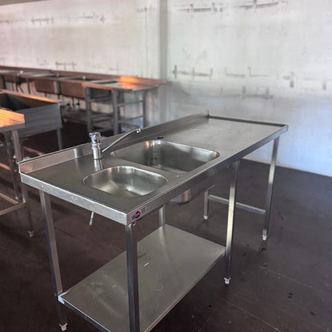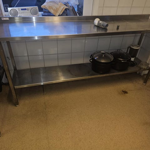 Rustfri benk med integrert vask og underhylle. Benken har en kum i rustfritt stål og blandebatteri montert på bakre del av benkeplaten. Under benkeplaten er det en hel hylle i rustfritt stål for oppbevaring. Avløpsrør i plast er montert under kummen. Egner seg til bruk i kjøkken, serveringssted eller annet arbeidsrom hvor det er behov for en solid arbeidsbenk med vask.