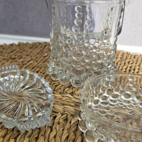 Rund bolle i klart glass med tilsvarende boblemønster rundt hele kanten. Egnet til servering av frukt, snacks eller som dekorativ skål.