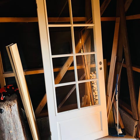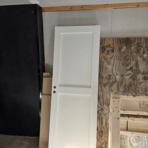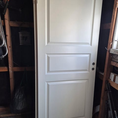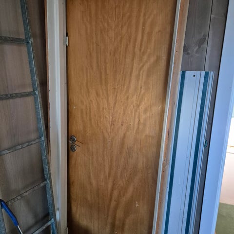 Innerdør i tre med glass og hvitmalt karm. Døren har låskasse. Egnet som innvendig dør mellom rom i bolig, bod eller lignende. Leveres med karm, uten beslag og håndtak etter det som fremgår av bildet.