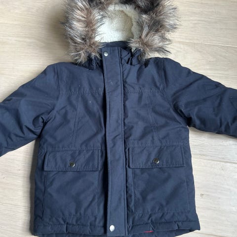 Kjøpt ny av oss. Knapt brukt, da vi bomma på størrelsen. Mørkeblå og svart, slik det første bildet viser. Tykk og varm jakke str 140 fra Name It.