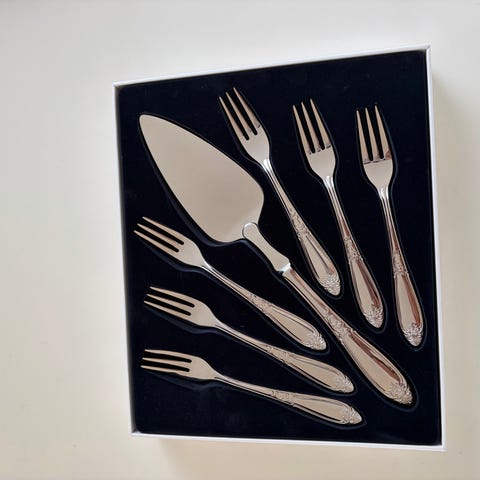 HardangerBestikk Nina kakesett i rustfritt stål i sølvfarge. Sett med kakespade og flere kakegafler med dekorert skaft. Egnet til servering av kaker og desserter ved borddekking til hverdag og selskap.