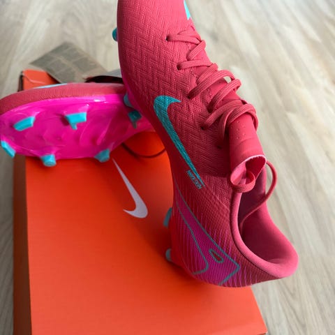 Nike fotballsko med AG-knotter (kunstgress). Størrelse 38.5. Kjøpt for 3399,- brukt i et par uker. Selges for 600,-. Kan sendes. Lys blå med rosa detaljer,