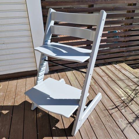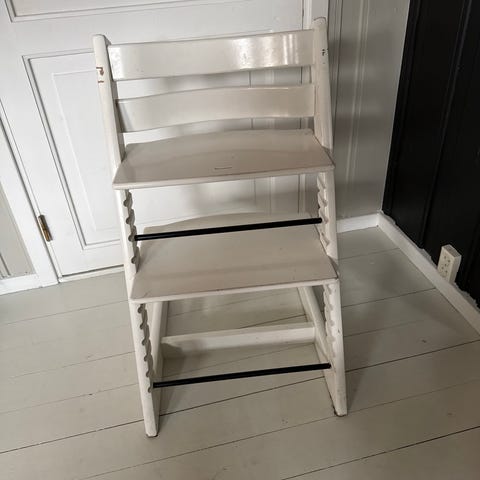 Stokke Tripp Trapp høy barnestol i hvitmalt tre. Klassisk trappeformet stol med justerbart sete og fotbrett som kan tilpasses barnets høyde. Egnet som spise- og sitteplass ved bord for barn i ulike aldre.