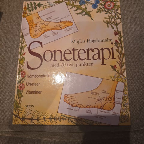 Maj-Lis Hagenmalm Soneterapi med 20 nye punkter tar for seg soneterapi som behandlingsform, med gjennomgang av soner på føtter og hender. Inneholder illustrerte soneterapikart og forklaringer til ulike punkter, inkludert 20 nye punkter. Teksten omtaler bruk av homøopatiske midler, urteteer og vitaminer i forbindelse med behandlingen.