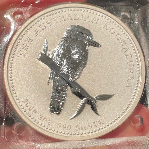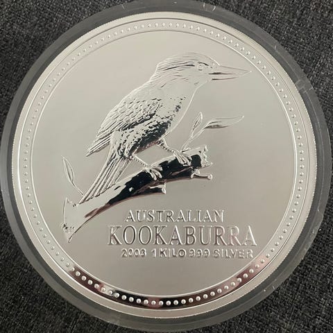 Selger en Australian Kookaburra fra 2000, preget i 1 oz .999 finsølv og oppbevart i kapsel.