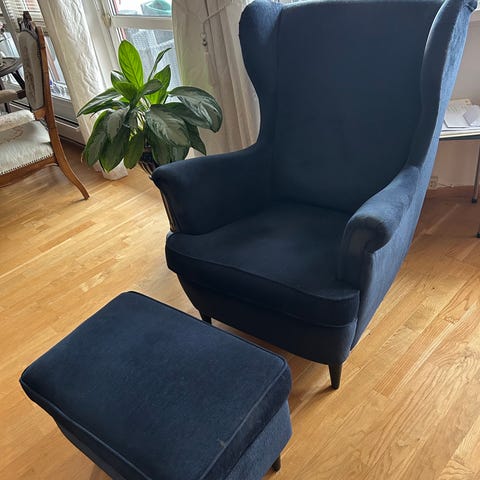 Ørelappstol med fotskammel , STRANDMON, IKEA