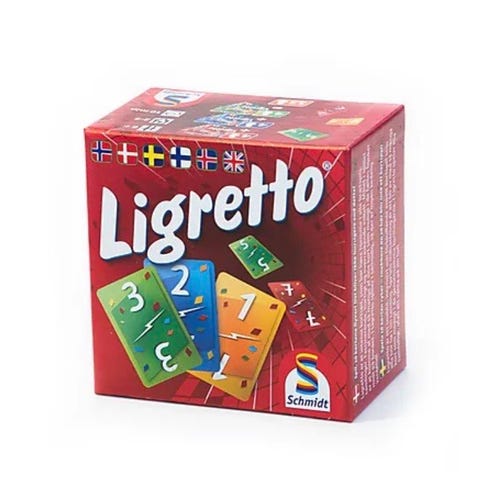 Schmidt Ligretto kortspill i blå og grønn utgave. Hver eske inneholder en egen kortstokk, og de ulike fargeutgavene kan kombineres for å spille med flere spillere samtidig.