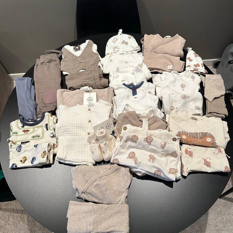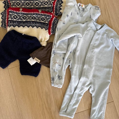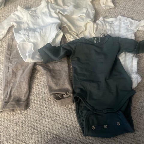 H&M KappAhl og BEBE, babyklær sett i bomull, unisex, størrelse 62. Settet inkluderer blant annet en mørk bukse i strikket bomull og andre plagg i myk bomullskvalitet. Klærne passer baby i ca. 2–4 måneder, og er laget av bomull som gir et mykt og behagelig materiale mot huden. Flerfargede deler i settet gir variasjon i bruk, og plaggene egner seg til daglig bruk for baby.