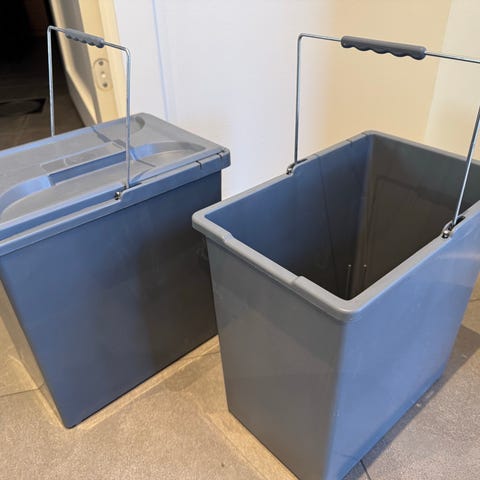Plast søppelbøtter med lokk i grå farge. Bøttene har hengslet lokk med utskiftbare fargemerker på toppen for enkel merking av innhold, for eksempel ulike typer avfall. Egner seg til kildesortering eller oppbevaring i kjøkken, bod eller vaskerom. Laget av hard plast som er enkel å rengjøre. Flere løse lokk følger med og kan oppbevares inni bøttene når de ikke er i bruk.