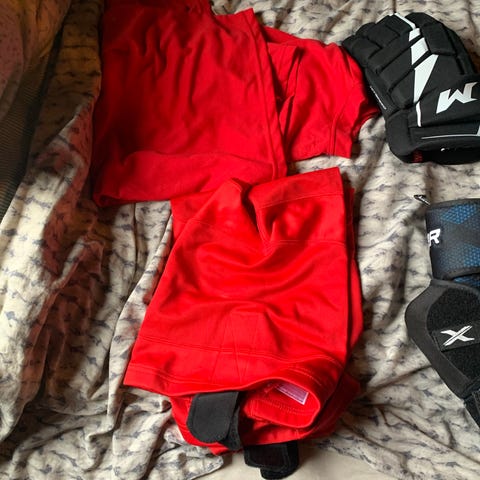 Kleim skøytedrakt helkropp i blå farge med røde og hvite sidepaneler. Drakten har høy hals og glidelås foran. Egnet til bruk sammen med ulike typer skøyter innen skøytesport. Passer til trening eller aktivitet på is der helkropps skøytedrakt er ønskelig.