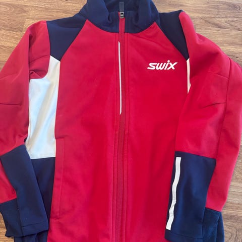 Swix junior jakke i størrelse 146 (merket Junior 10–12 år). Jakken er rød med hvite detaljer og hel glidelås foran. Den har glidelåslommer i siden og elastikk nederst på ermene for bedre passform. Egnet som ytterjakke til barn i hverdagen eller til ulike uteaktiviteter.