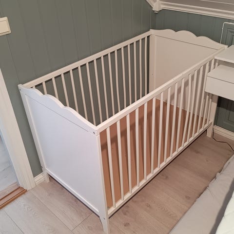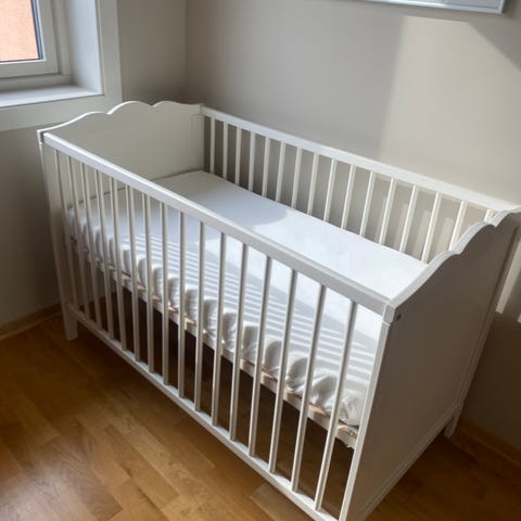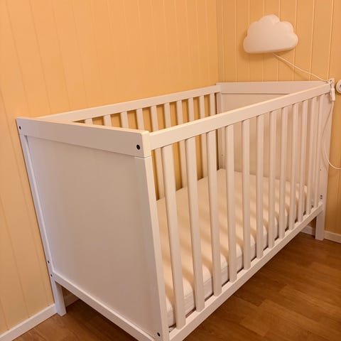 IKEA Sundvik sprinkelseng i hvit utførelse. Klassisk barneseng med sprosser på alle sider og tette endeplater. Passer standard madrass til sprinkelseng. Egnet for spedbarn og småbarn innenfor anbefalt alders- og vektgrense fra produsenten. Sengen har enkel, rett design som passer inn i de fleste barnerom.