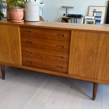 Skjenken er utført i teak og er i god vintage stand. Noen merker, spesielt på toppen.Ellers i god stand,