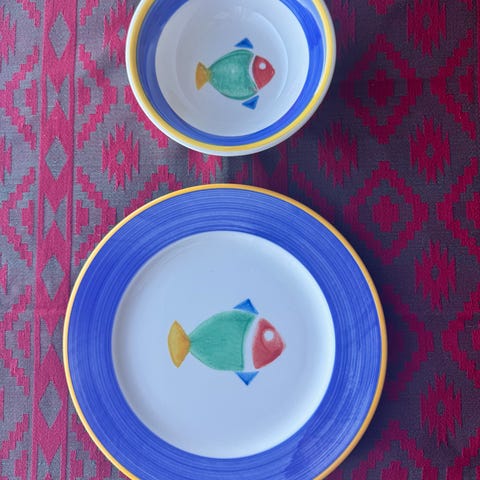 Flott sett med italiensk keramikk bestående av 6 middagstallerkener og ett stort serveringsfat. Motivene har et dekorativt maritimt tema med krabbe og fisk – perfekt til sjømatservering eller som et blikkfang på bordet.