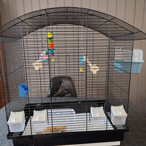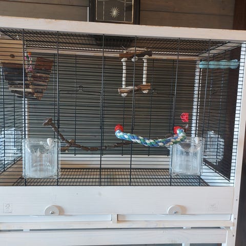 Et stort Ferplast fuglebur i tre/metall, plastbunn med 2 uttrekkbare skuffer. Noen gnagemerker i treverket. Litt løse fester til matkoppene, men dette kan nok løses med et par strips. Ellers i god stand. Mye ekstra utstyr: to sittepinner i tre, en bøyelig tauverk, som enten kan brukes som sitteordning i buret eller henges i taket utenfor buret. Stige, speil, matkopp, ulike matholdere og en uv-pære spesialtilpasset fugler. ( Ikea lampeskjerm i hvitt metall selges separat for 150.-)