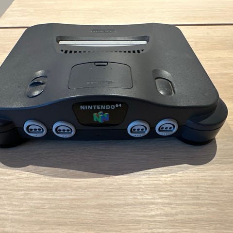 Nintendo 64 spillkonsoll. Klassisk stasjonær konsoll fra Nintendo med fire kontrollerporter på fronten og toppmontert kassettspor for spillkassetter.