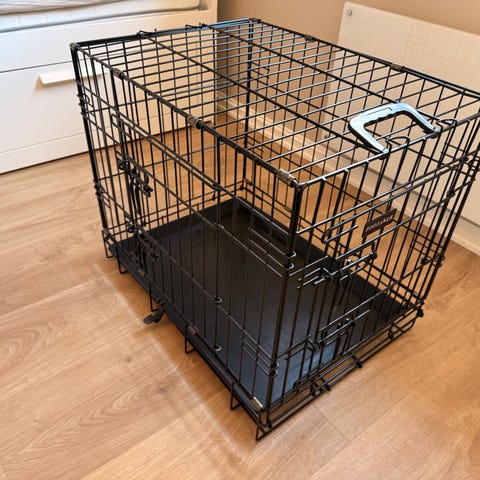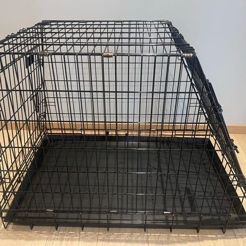 Hundebur i metall med plast bunn og svart trekk. Trekket dekker hele buret og festes nede med strikk. Det har glidelåsåpning fremme som kan rulles opp og festes opprullet. Det er nettingfelt "vindu" for lufting på sidene. Buret har dør på kortsiden også, men den får man ikke brukt med trekket på.