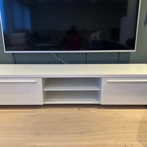 Stilren og praktisk TV-benk med god oppbevaringsplass. Benken har to romslige skuffer og to åpne hyller, perfekt for oppbevaring av TV-utstyr, spillkonsoller eller dekor. Enkel og tidløs design som passer i de fleste stuer.