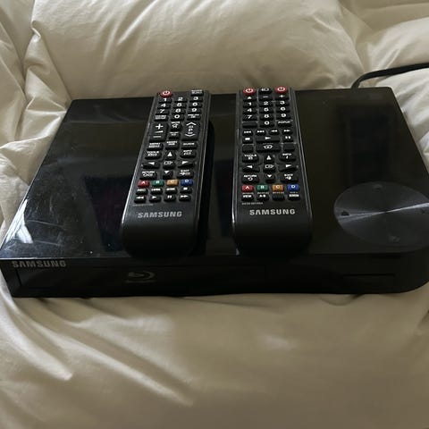 Samsung Blu- ray spiller i sølvfarge. Enheten har flere tilkoblingsmuligheter på baksiden, blant annet HDMI, komponent- og komposittutganger, analoge lydutganger samt nettverkstilkobling.