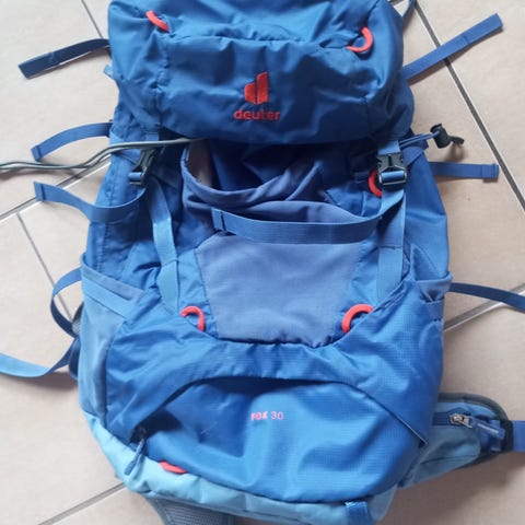 Bergans ryggsekk i blå farge. Sekken har polstret bæresystem med justerbare skulderremmer, brystreim og hoftebelte med lommer. Hovedrommet har glidelåslukking og flere innvendige lommer, blant annet nettinglomme og glidelåslomme for mindre gjenstander. Utvendig har sekken flere festepunkter og strammereimer for å feste og komprimere innhold. Egnet til tur, fritid og hverdagsbruk. Alle glidelåser og sømmer er hele og fine.