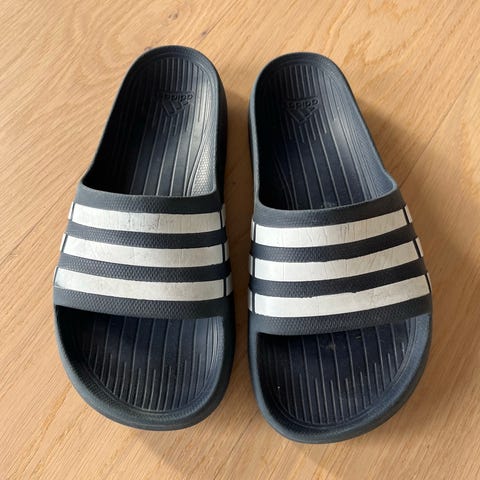 Adidas badesandaler i størrelse 40. Modellen har klassisk design med tre hvite striper over foten og svart såle. Sandalene er laget i syntetisk materiale som tåler fukt, egnet til bruk på stranden, ved basseng eller som enkle sandaler til hverdagsbruk.