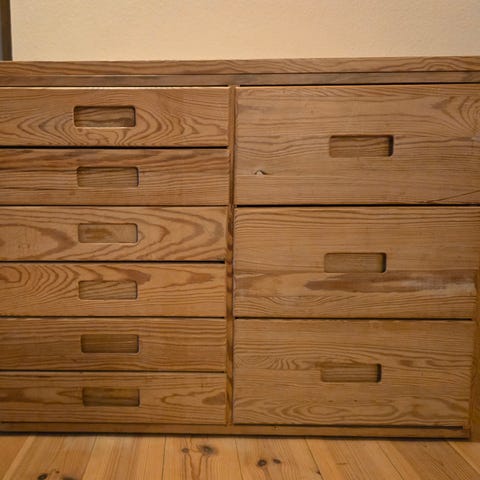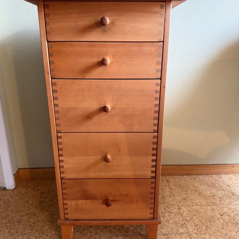 Eldre modell fra Ikea. 6 skuffer. Farge: Lakkert furu. Liten skade på høyre sidevang (se bilde), ellers i god stand.