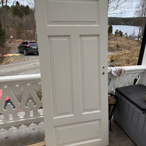 Innerdør i tre med klassisk fyllingsdesign fra begynnelsen av 1800 tallet. Begge dørene er malt hvit på den ene siden, og den andre er ubehandlet treverk. Dørene har utsparinger for låskasse og dørhåndtak. Egner seg som innvendige dører i en gammel bolig eller hytte, og kan males eller behandles etter behov.