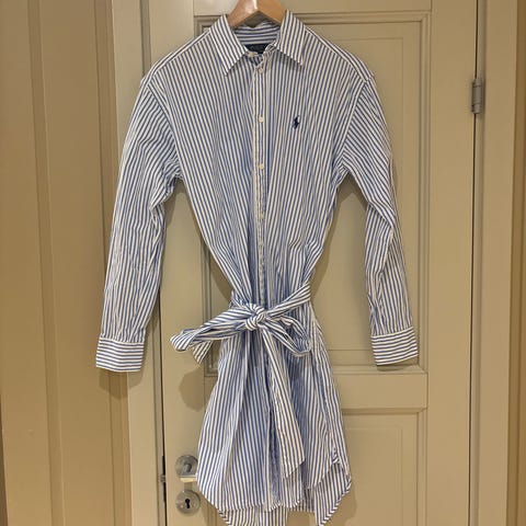 Ralph Lauren Lauren hverdagskjole for dame i størrelse S. Kjolen er rød og laget hovedsakelig av bomull med noe elastan for stretch, ifølge vaskelappen. Modellen har korte ermer med oppbrett og en enkel, rett overdel som går over i et utsvinget skjørt. Passer som hverdagskjole eller til enkle, pene anledninger.