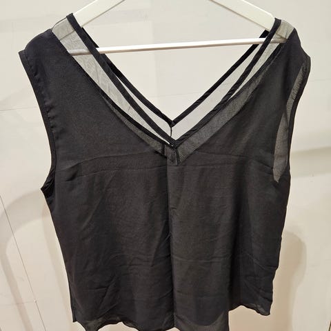 Soyaconcept singlet for dame i størrelse L. Singleten er svart, i polyester, ermeløs med V-hals og volangdetaljer langs halsåpning og skuldre. Sendes mot at kjøper betaler frakt.
